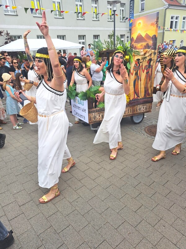 Und dieses Jahr wurde es richtig majestätisch – denn die Wohnungsbaugesellschaft mbH  Malchow verwandelte sich kurzerhand in ein ägyptisches Königshaus. Unter dem Motto „Wohnen wie Cleopatra“ zogen Mitarbeiterinnen und Mitarbeiter in goldenen Gewändern, funkelndem Schmuck und dramatischem Lidstrich mit ihrem prachtvoll gestalteten Wagen durch die Stadt. Und wer ganz genau hinsah, konnte sogar eine Sphinx am Wagen entdecken - sie hat sich aber nicht bewegt – vermutlich wohnungslos 😊.